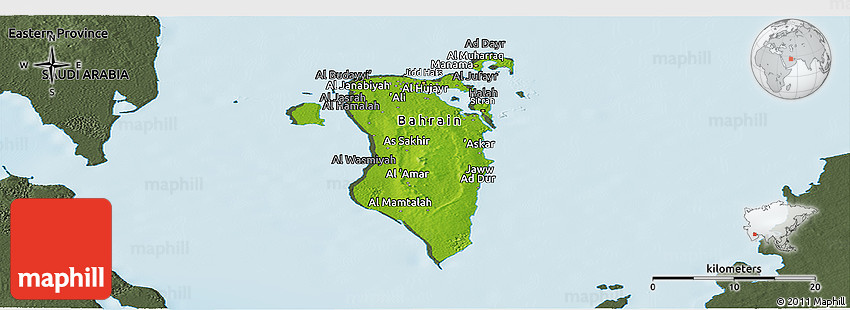 Physical map illustrates the mountains, lowlands, oceans, lakes and rivers and other physical landscape features of Bahrain. Differences in land elevations relative to the sea level are represented by color.