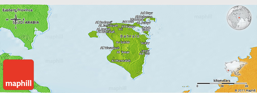 Physical map illustrates the mountains, lowlands, oceans, lakes and rivers and other physical landscape features of Bahrain. Differences in land elevations relative to the sea level are represented by color.