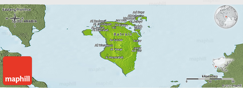 Physical map illustrates the mountains, lowlands, oceans, lakes and rivers and other physical landscape features of Bahrain. Differences in land elevations relative to the sea level are represented by color.