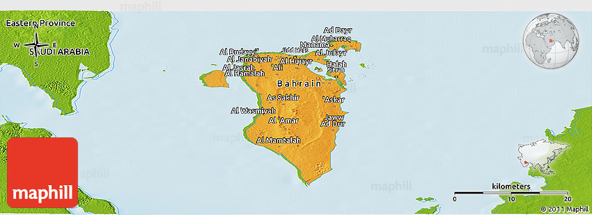Physical map illustrates the mountains, lowlands, oceans, lakes and rivers and other physical landscape features of Bahrain. Differences in land elevations relative to the sea level are represented by color.