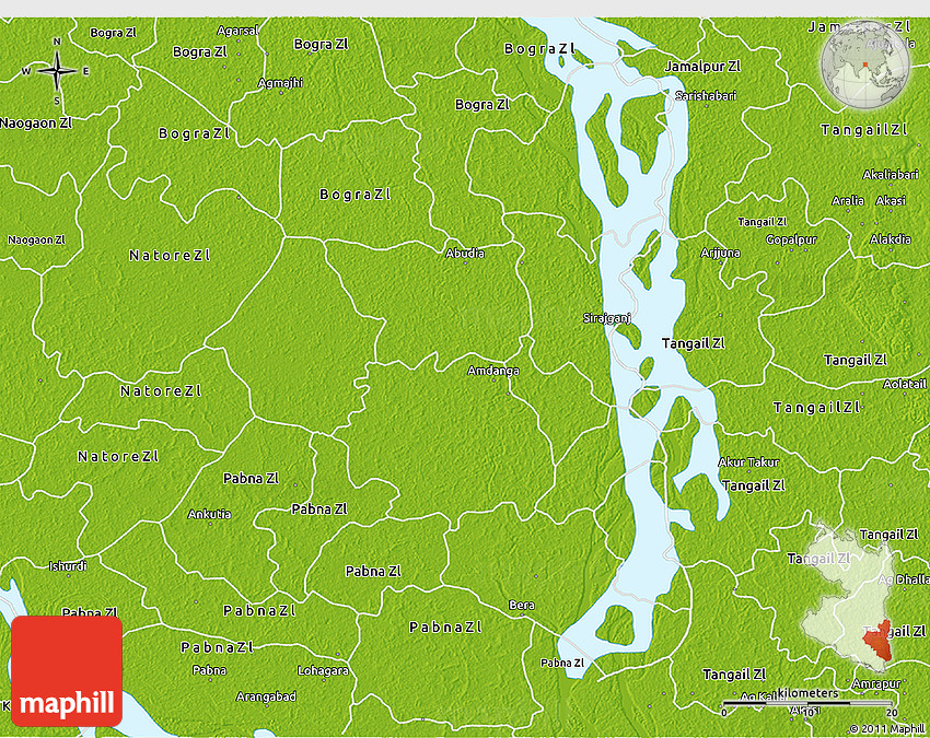 Physical map illustrates the mountains, lowlands, oceans, lakes and rivers and other physical landscape features of Sirajganj Zl. Differences in land elevations relative to the sea level are represented by color.