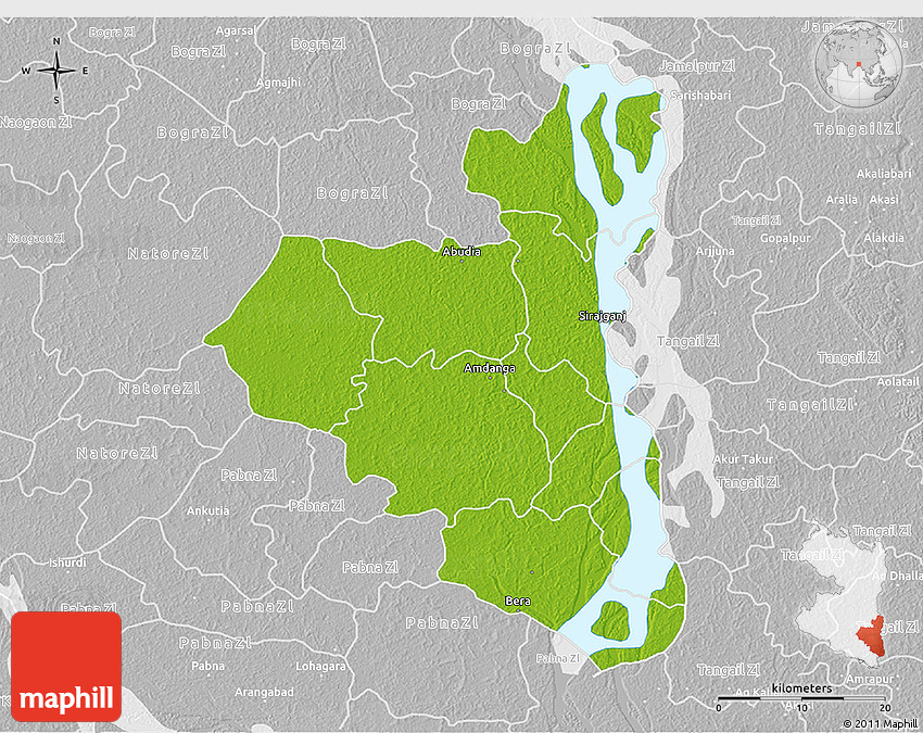 Physical map illustrates the mountains, lowlands, oceans, lakes and rivers and other physical landscape features of Sirajganj Zl. Differences in land elevations relative to the sea level are represented by color.