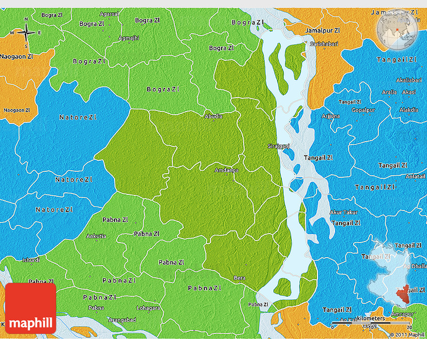 Physical map illustrates the mountains, lowlands, oceans, lakes and rivers and other physical landscape features of Sirajganj Zl. Differences in land elevations relative to the sea level are represented by color.