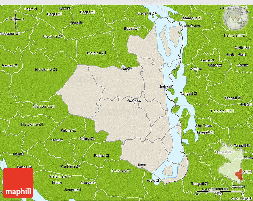 Physical map illustrates the mountains, lowlands, oceans, lakes and rivers and other physical landscape features of Sirajganj Zl. Differences in land elevations relative to the sea level are represented by color.