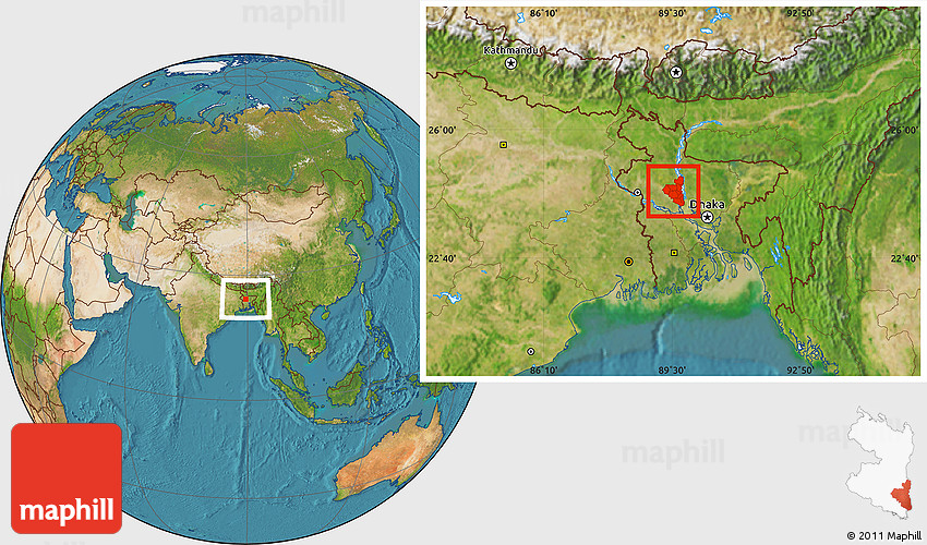 Maphill is a collection of map images. This image combines a satellite map with the globe centered on Sirajganj Zl. Use the buttons under the image to switch to different map types.
