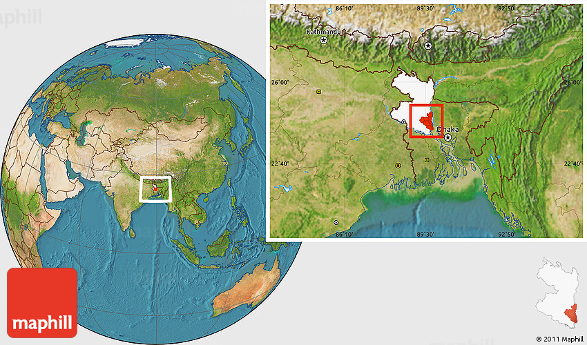 Maphill is a collection of map images. This image combines a satellite map with the globe centered on Sirajganj Zl. Use the buttons under the image to switch to different map types.