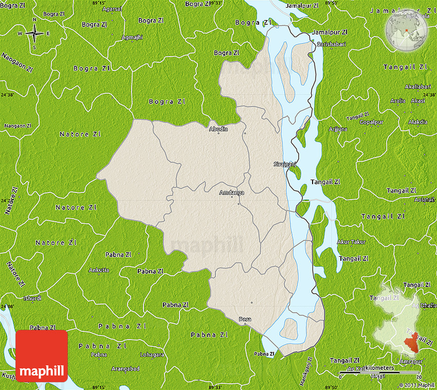 Physical map illustrates the mountains, lowlands, oceans, lakes and rivers and other physical landscape features of Sirajganj Zl. Differences in land elevations relative to the sea level are represented by color.