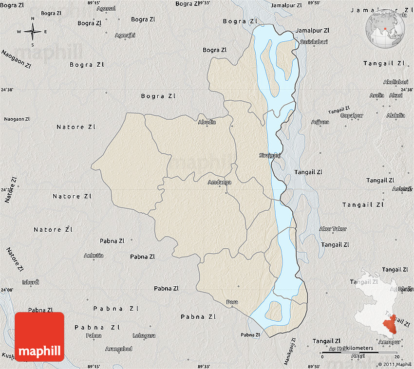 The value of Maphill lies in the possibility to look at the same area from several perspectives. Maphill presents the map of Sirajganj Zl in a wide variety of map types and styles.