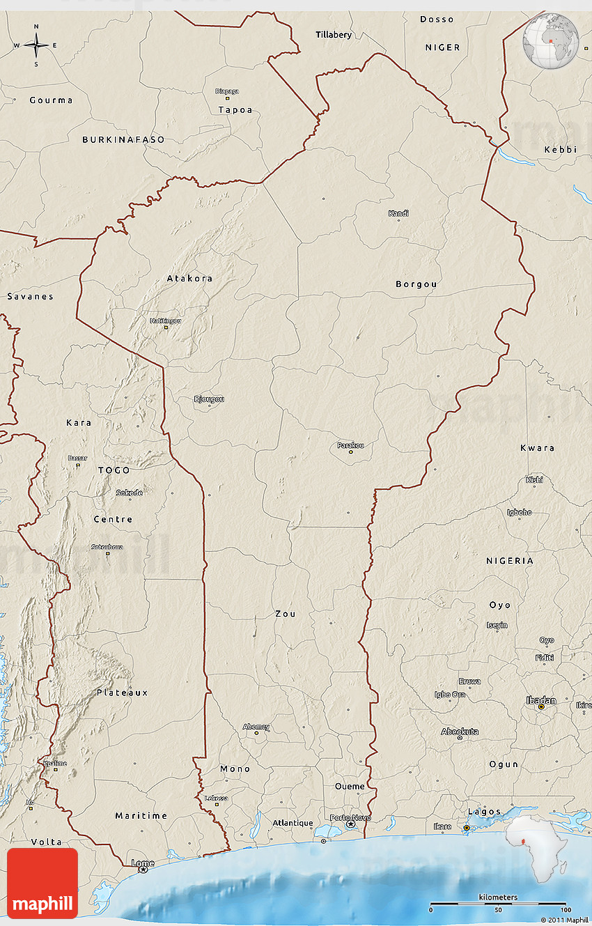 The 3D shaded relief map represents one of many map types and styles available. Look at Benin from different perspectives.