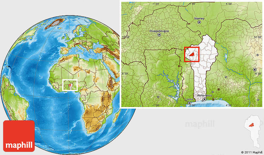 Maphill is a collection of map images. This image combines a physical map with the globe centered on Tchoukoutouna. Use the buttons under the image to switch to different map types.