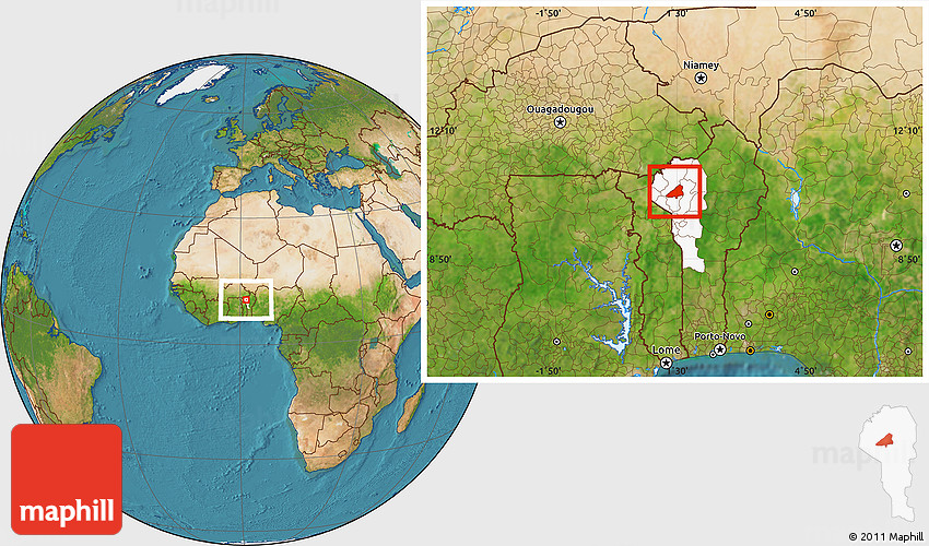Maphill is a collection of map images. This image combines a satellite map with the globe centered on Tchoukoutouna. Use the buttons under the image to switch to different map types.