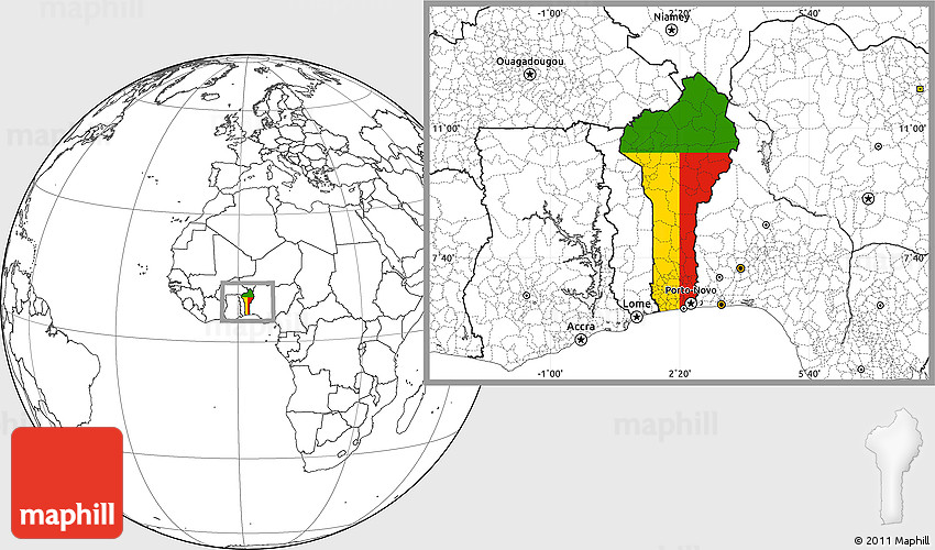 Maphill is a collection of map images. This image combines a flag map with the globe centered on Benin. Use the buttons under the image to switch to different map types.