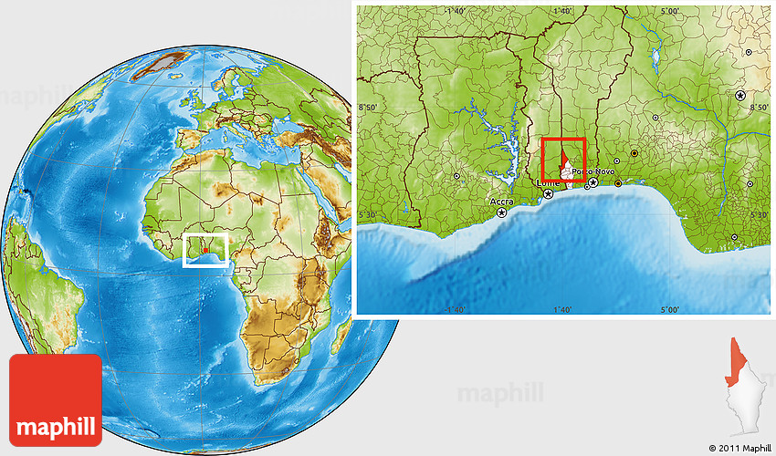 Maphill is a collection of map images. This image combines a physical map with the globe centered on Aplahoue. Use the buttons under the image to switch to different map types.
