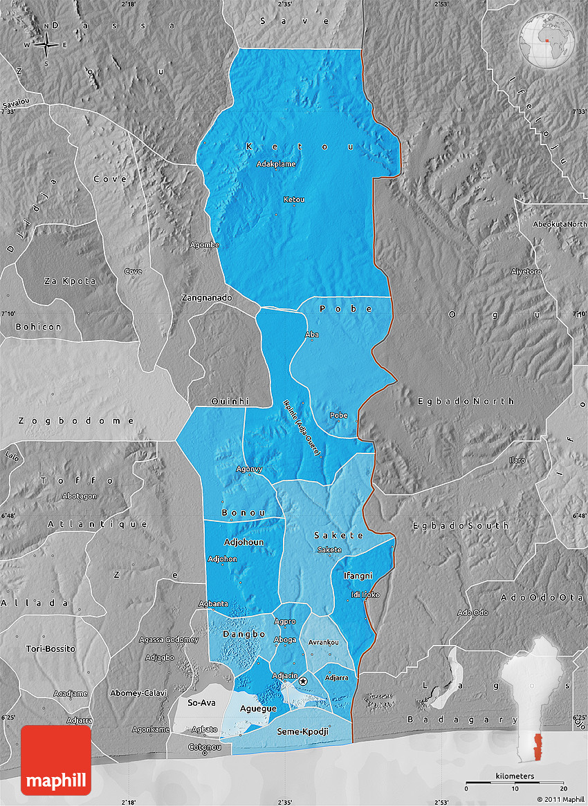Political shades map is similar to a political map, however different regions are represented by the tints and shades of the same color, not by different colors. The purpose of a political map of Oueme is to provide information about how people have divided up the world into countries and administrative regions.