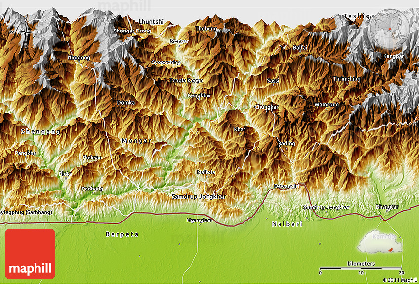 Physical map illustrates the mountains, lowlands, oceans, lakes and rivers and other physical landscape features of Pema Gatshel. Differences in land elevations relative to the sea level are represented by color.