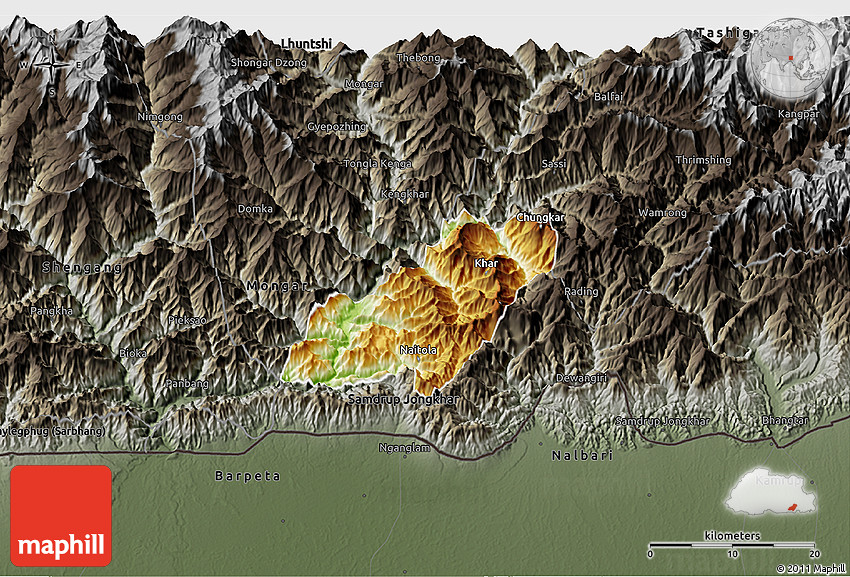 Physical map illustrates the mountains, lowlands, oceans, lakes and rivers and other physical landscape features of Pema Gatshel. Differences in land elevations relative to the sea level are represented by color.