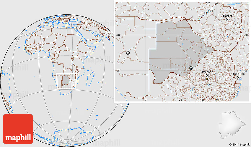 Maphill is a collection of map images. This image combines a gray map with the globe centered on Botswana. Use the buttons under the image to switch to different map types.