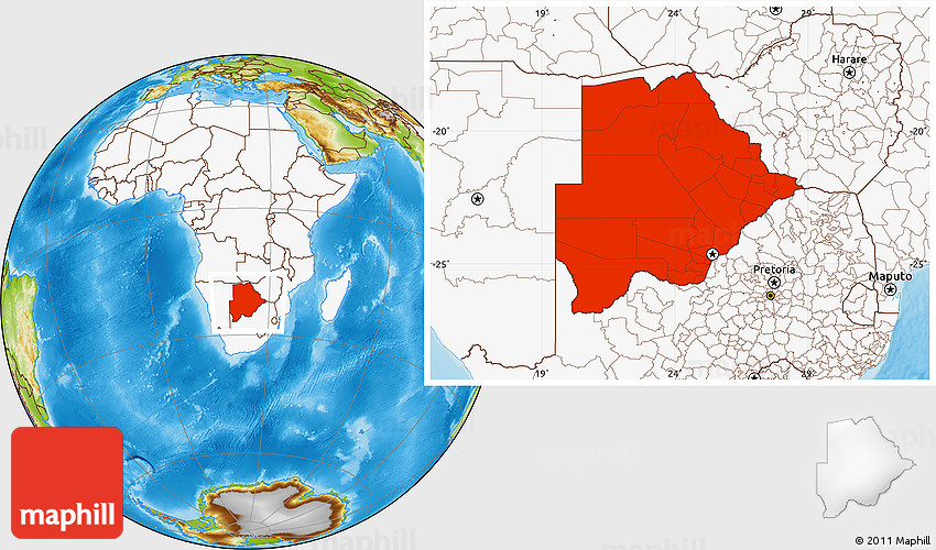 Maphill is a collection of map images. This image combines a physical map with the globe centered on Botswana. Use the buttons under the image to switch to different map types.