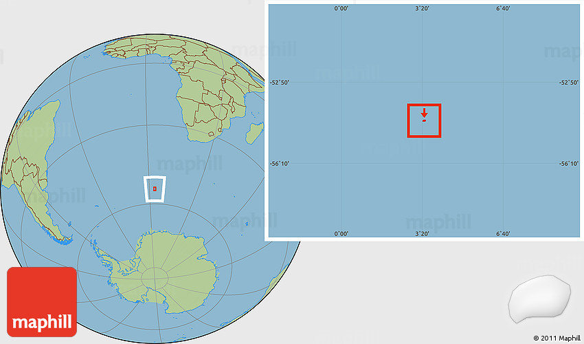 The location map of Bouvet Island combines two projections: the orthographic azimuthal projection for the globe and the simple geographic projection for the rectangular part of the map. Geographic projection has straight meridians and parallels, each degree of latitude and longitude is the same size over the entire world map.