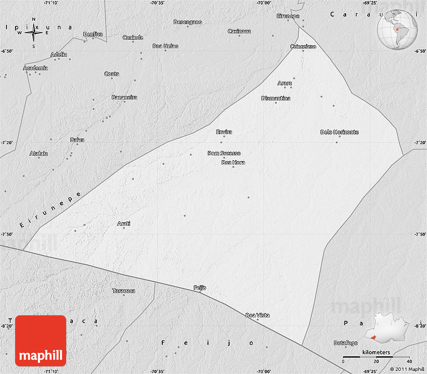 The flat silver style map represents one of several map types and styles available. Look at Envira, Amazonas, Brazil from different perspectives.