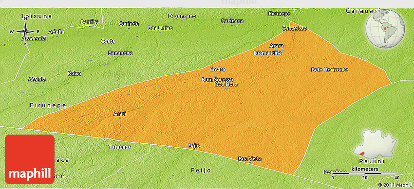 Physical map illustrates the mountains, lowlands, oceans, lakes and rivers and other physical landscape features of Envira. Differences in land elevations relative to the sea level are represented by color.