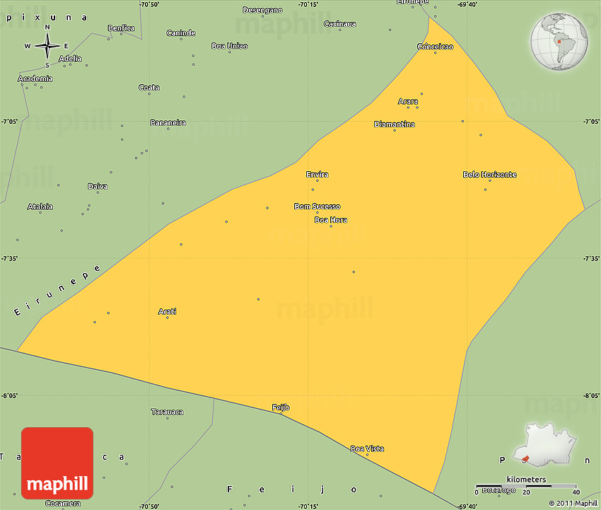 The simple savanna style outline map represents one of several map types and styles available. Look at Envira, Amazonas, Brazil from different perspectives.