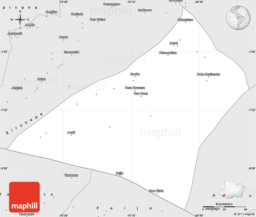 The simple silver style outline map represents one of several map types and styles available. Look at Envira, Amazonas, Brazil from different perspectives.
