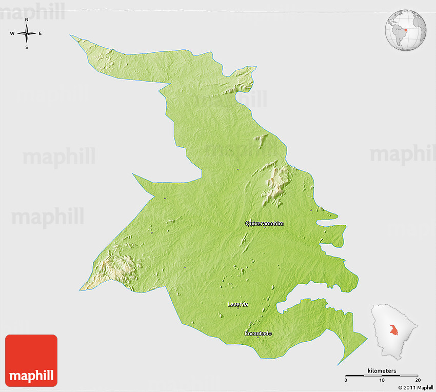 The 3D physical map represents one of several map types and styles available. Look at Quixeramobim, Ceara, Brazil from different perspectives.