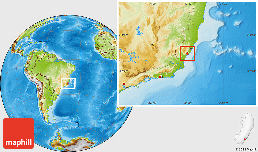 Maphill is a collection of map images. This image combines a physical map with the globe centered on Anchieta. Use the buttons under the image to switch to different map types.