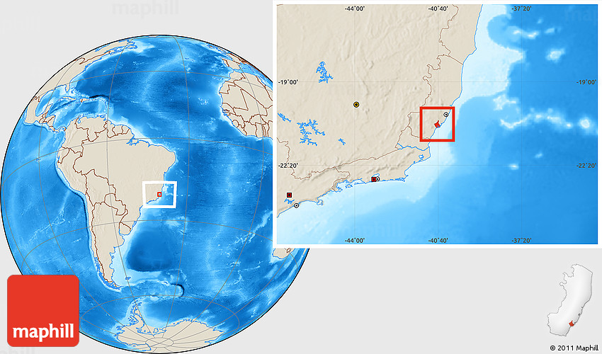 Maphill is a collection of map images. This image combines a shaded relief map with the globe centered on Anchieta. Use the buttons under the image to switch to different map types.