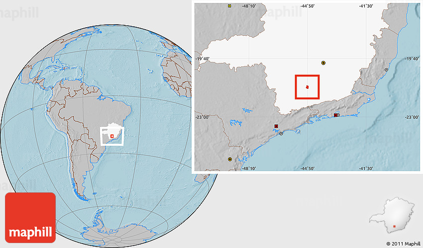 Maphill is a collection of map images. This image combines a gray map with the globe centered on Itumirim. Use the buttons under the image to switch to different map types.