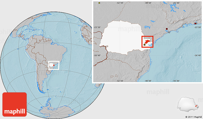 Maphill is a collection of map images. This image combines a gray map with the globe centered on Bocaiuva do Sul. Use the buttons under the image to switch to different map types.
