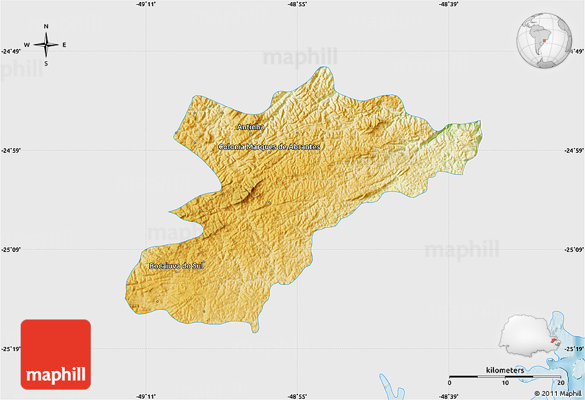 Each map type offers different information and each map style is designed for a different purpose. Read about the styles and map projection used in the above map (Physical Map of Bocaiuva Do Sul, single color outside).