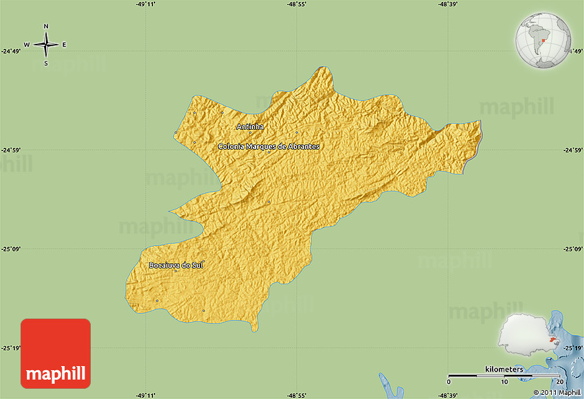 The flat savanna style map represents one of several map types and styles available. Look at Bocaiuva do Sul, Parana, Brazil from different perspectives.