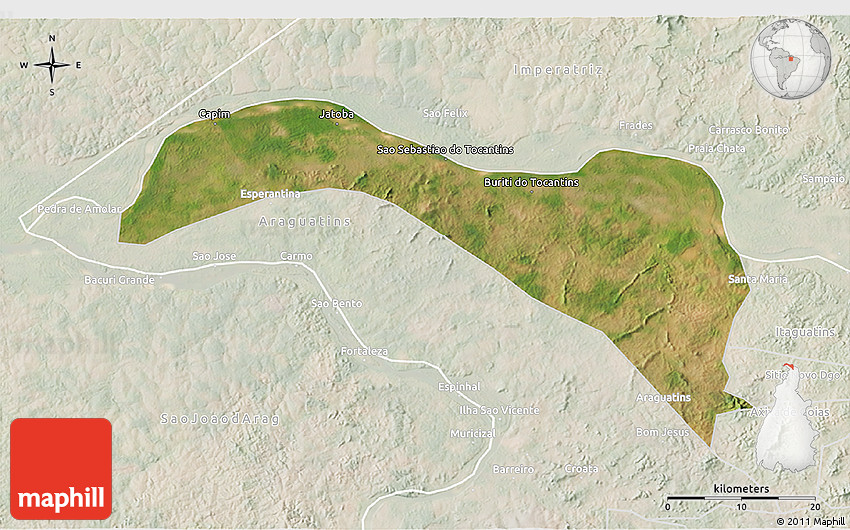 The 3D satellite map represents one of several map types and styles available. Look at S.Sebast.D'toca, Tocantins, Brazil from different perspectives.