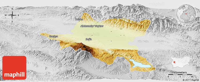 The panoramic physical map represents one of many map types and styles available. Look at Sofija from different perspectives.