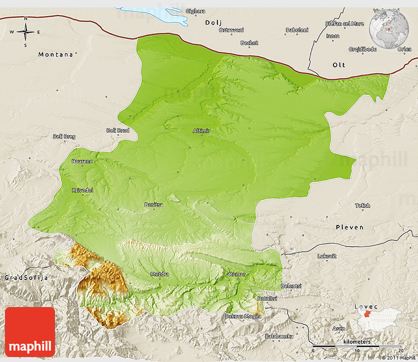 Physical map illustrates the mountains, lowlands, oceans, lakes and rivers and other physical landscape features of Vraca. Differences in land elevations relative to the sea level are represented by color.