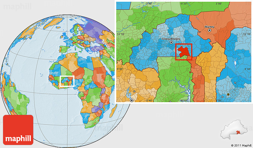 Maphill is a collection of map images. This image combines a political map with the globe centered on Boulgou. Use the buttons under the image to switch to different map types.
