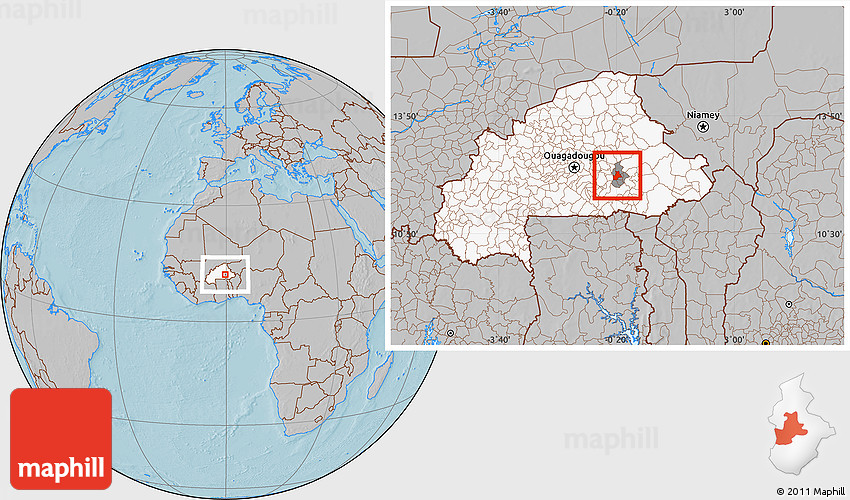 Maphill is a collection of map images. This image combines a gray map with the globe centered on Koupela. Use the buttons under the image to switch to different map types.