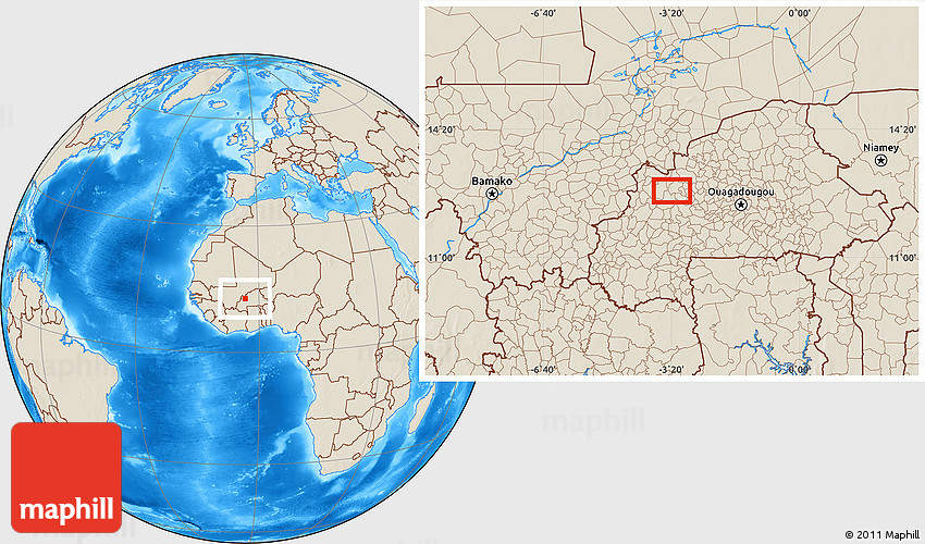 The shaded relief location map represents one of many map types and styles available. Look at Yaran, Lanfiera, Sourou, Burkina Faso from different perspectives.