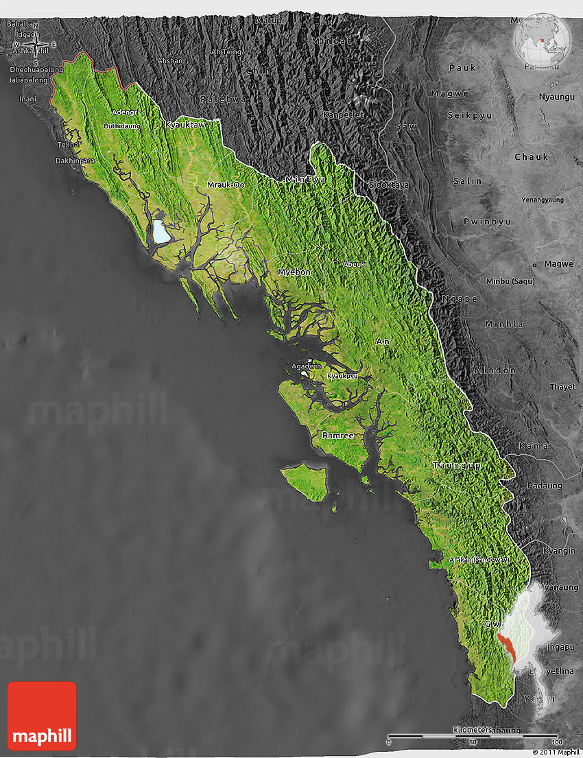 Satellite map shows the Earth's surface as it really looks like. The above map is based on satellite images taken on July 2004. This satellite map of Arakan (Rakhine) is meant for illustration purposes only. For more detailed maps based on newer satellite and aerial images switch to a detailed map view.