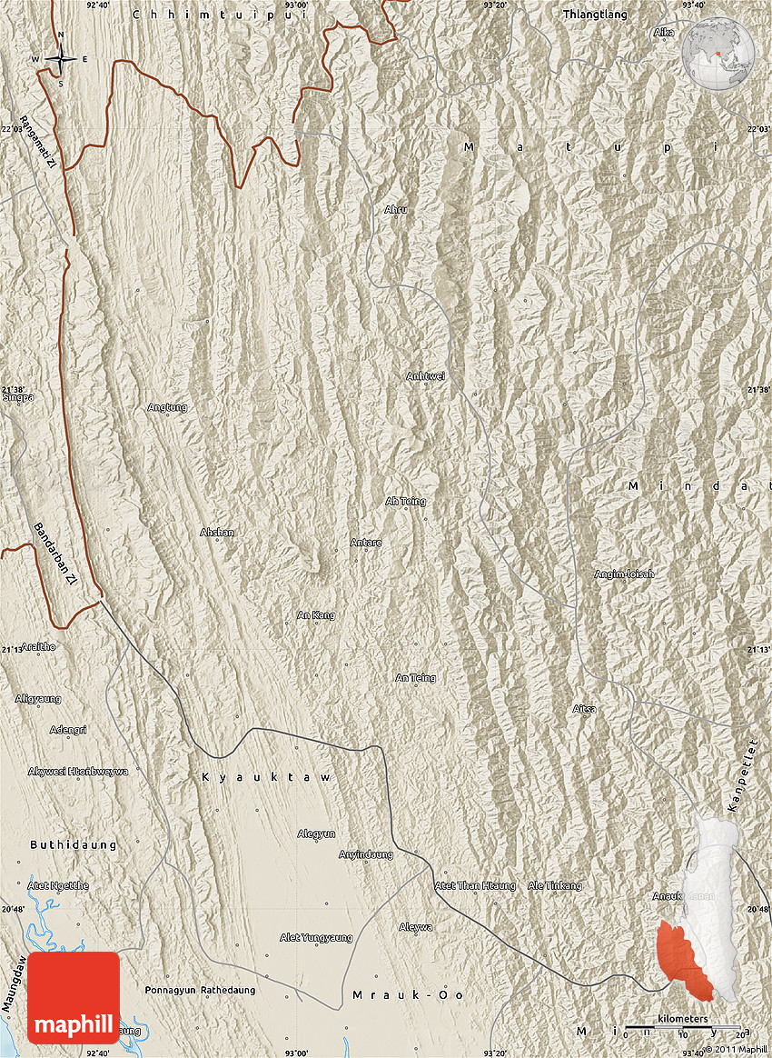 The flat shaded relief map represents one of several map types and styles available. Look at Paletwa, Chin, Burma from different perspectives.