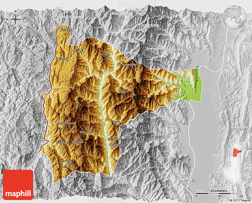 The 3D physical map represents one of several map types and styles available. Look at Tiddim, Chin, Burma from different perspectives.