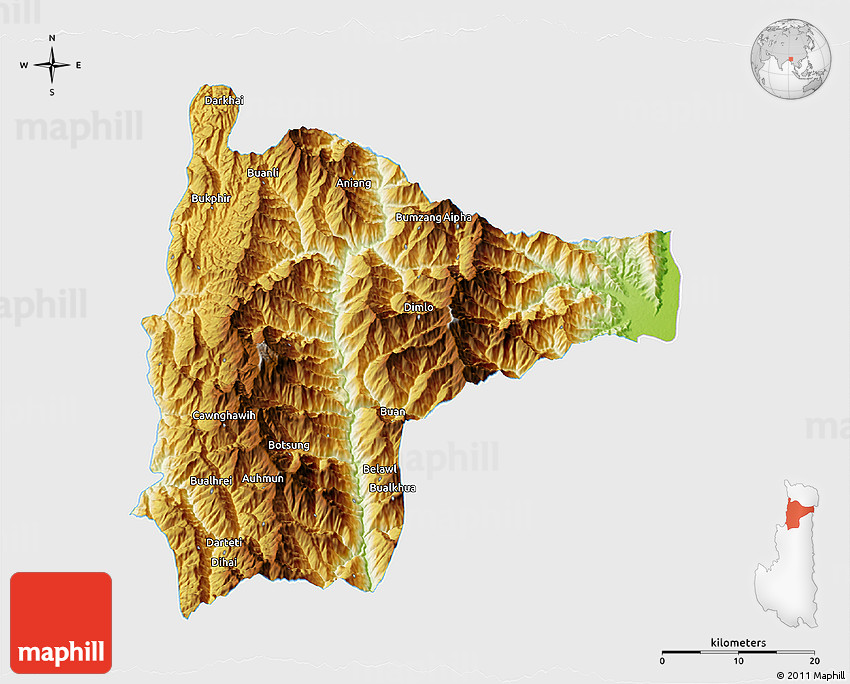 The 3D physical map represents one of several map types and styles available. Look at Tiddim, Chin, Burma from different perspectives.