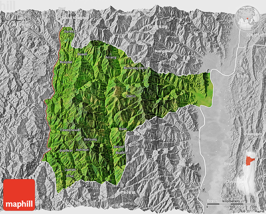 The 3D satellite map represents one of several map types and styles available. Look at Tiddim, Chin, Burma from different perspectives.
