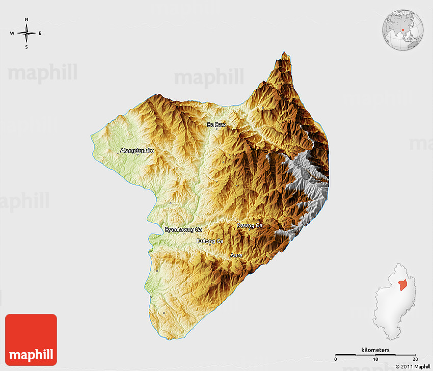 The 3D physical map represents one of several map types and styles available. Look at Machanbaw, Kachin, Burma from different perspectives.