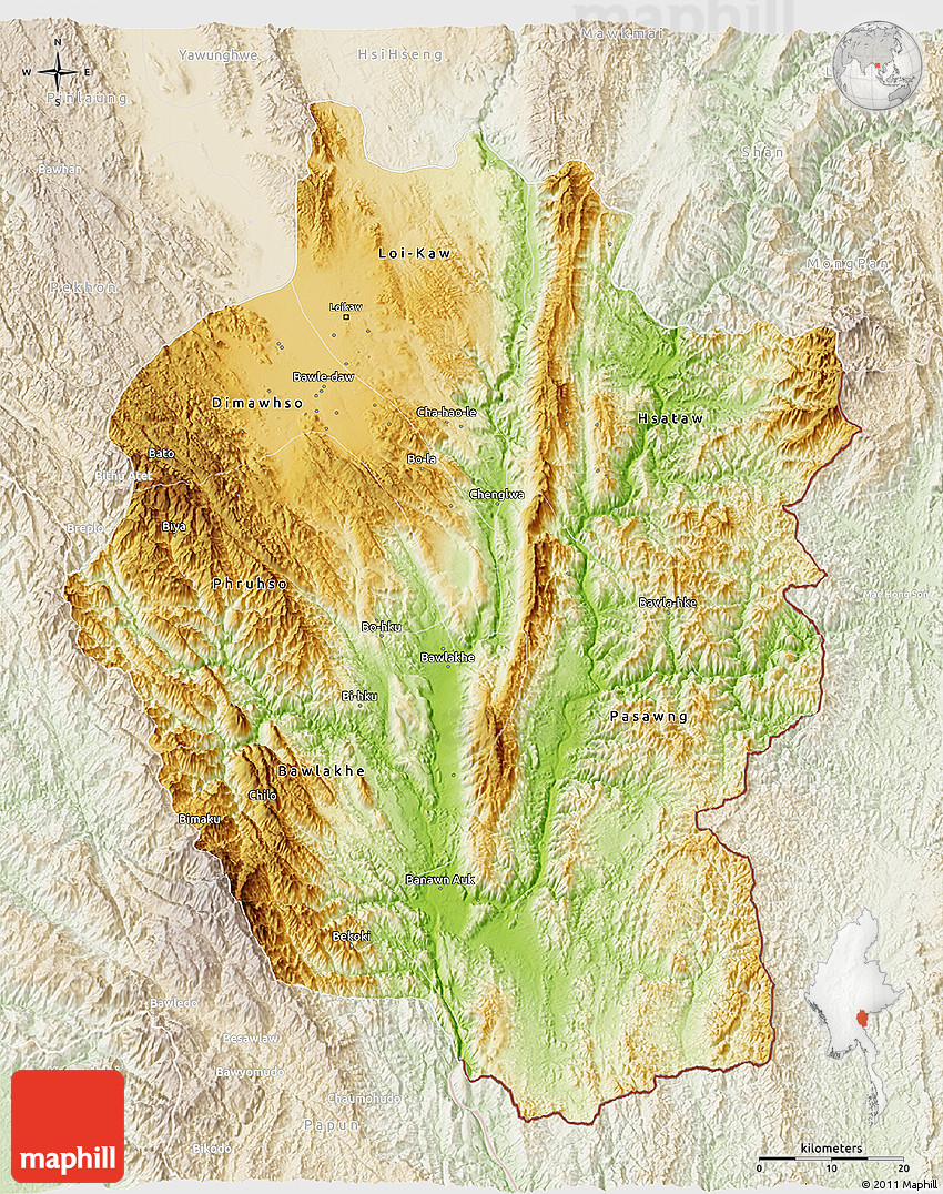 Physical map illustrates the mountains, lowlands, oceans, lakes and rivers and other physical landscape features of Kayah. Differences in land elevations relative to the sea level are represented by color.