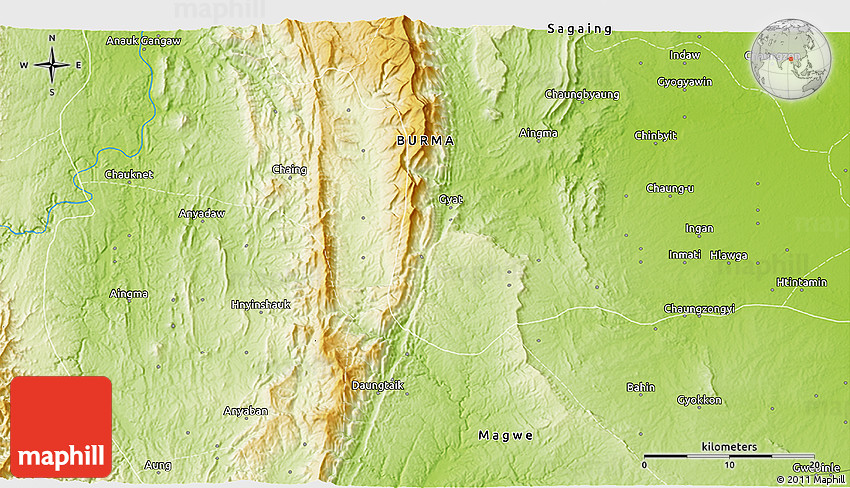 The 3D physical map represents one of many map types and styles available. Look at Kinban, Htilin, Magwe, Burma from different perspectives.