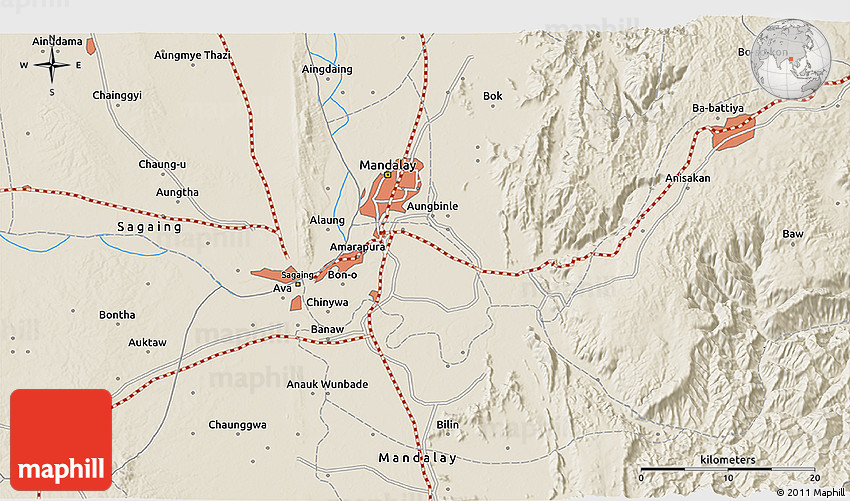 The 3D shaded relief map represents one of many map types and styles available. Look at Myaukkaing, Amarapura, Mandalay, Burma from different perspectives.