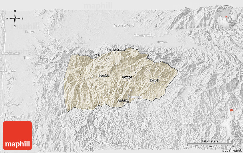 Shaded relief map shows landscape features, such as mountains, valleys and plateaus. Flat areas are smooth on the map, areas with steep slopes and mountains appear more rough. The above map of Mogok was created using a digital elevation model.
